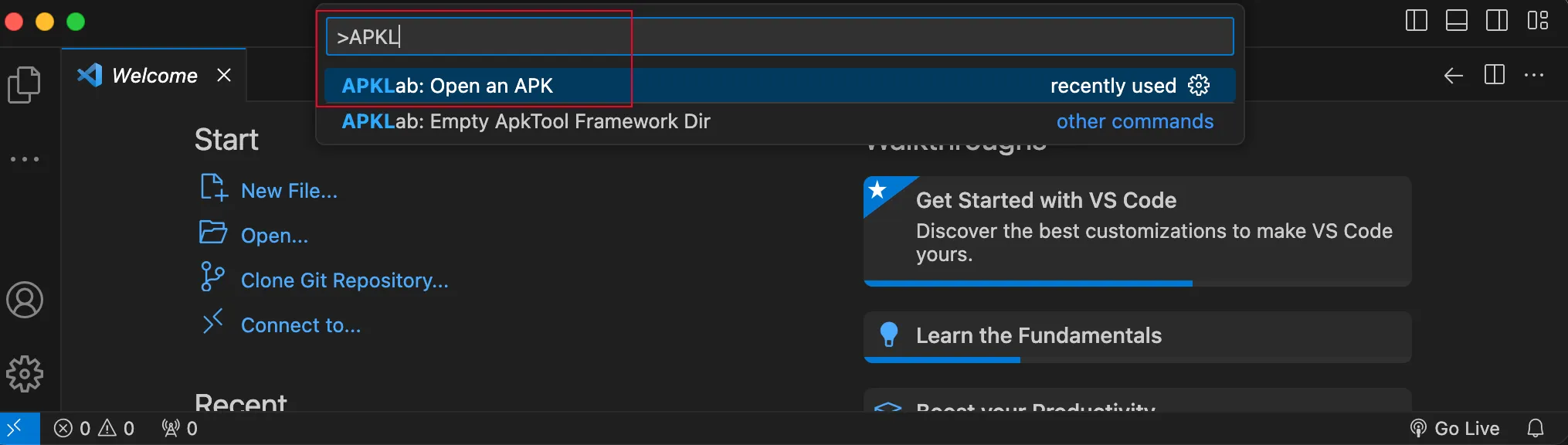 Open VSCode and press “Ctrl + Shift + p” then search for “APKLab”. Click on “Open an apk”