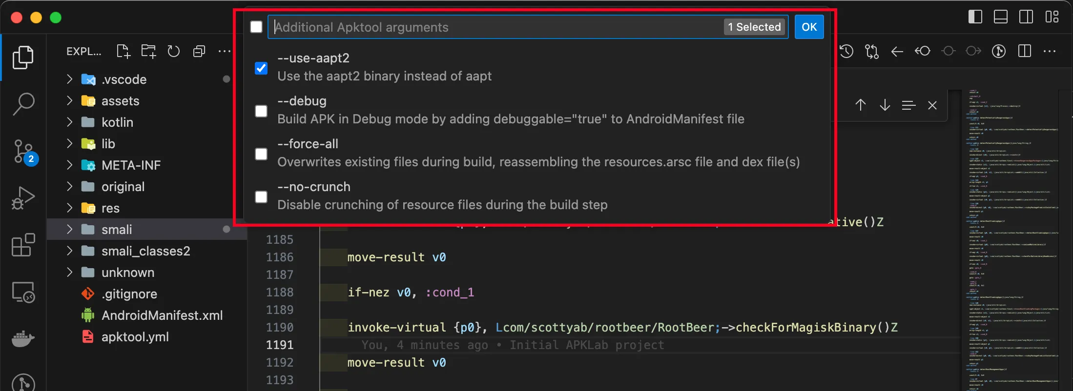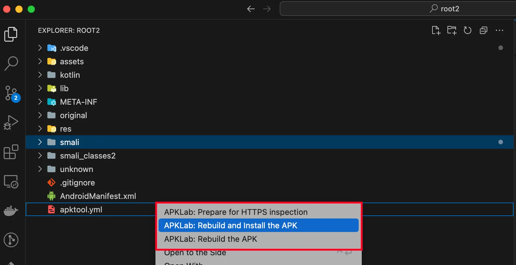 Right click on “apktool.yml”. Select an option you fit. The APKLab will rebuild and sign the application for you