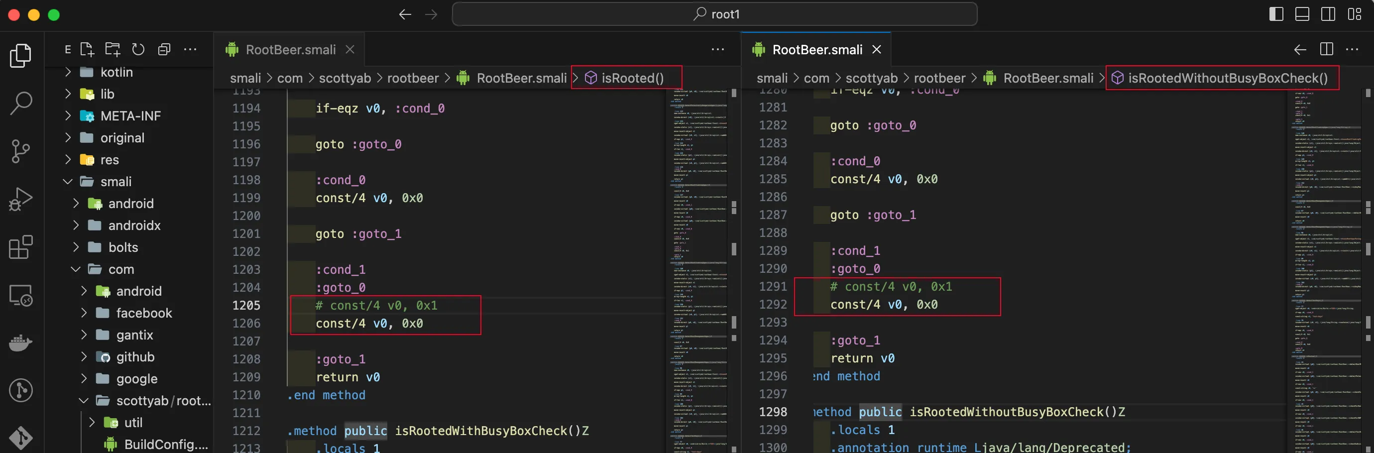 2. Search for keywords such as isRoot, “su”, “su” and etc.